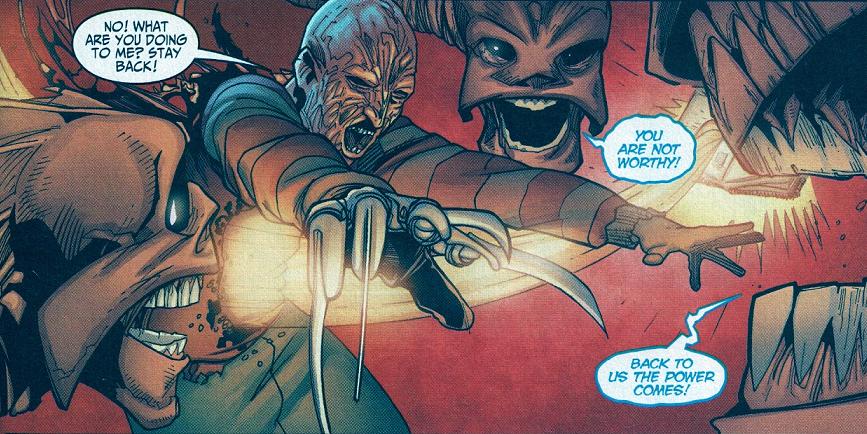 When Freddy's armies and the Nightmare Warriors, led by Ash Williams, battle on the lawn of the White House in Washington DC, Freddy, after absorbing the soul of the slain Jason and after Doctor Neil Gordon and the spirit of Nancy Thompson open a portal using the Necronomicon Ex-Mortis, is confronted by the Dream Demons, who crawl out of the pages of the Necronomicon. Surrounding their agent, the Dream Demons, for vague reasons ("We gave you power and now we have nothing!") deem Freddy unworthy and strip him of his powers, including those he gained from the Necronomicon. With their work done, the Dream Demons disintegrate as Freddy, mortally wounded by a blast from Ash's shotgun, is sucked into the Necronomicon's portal.[1]
