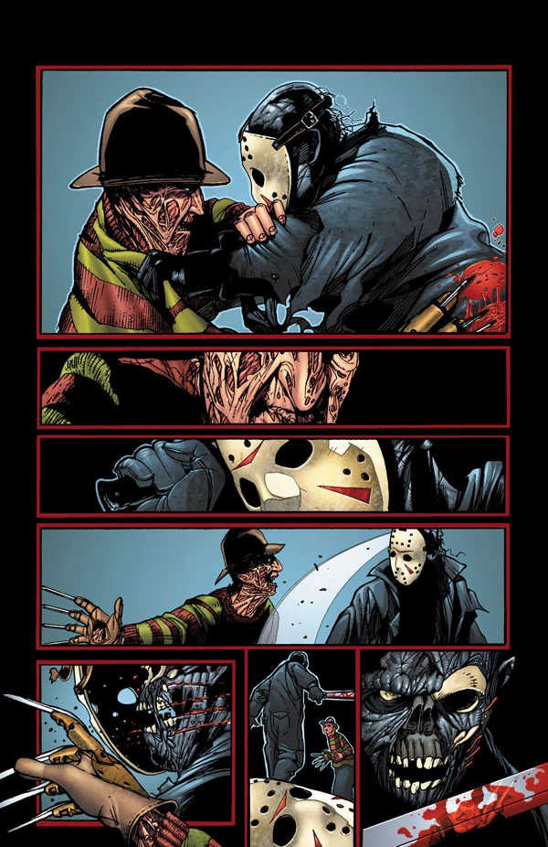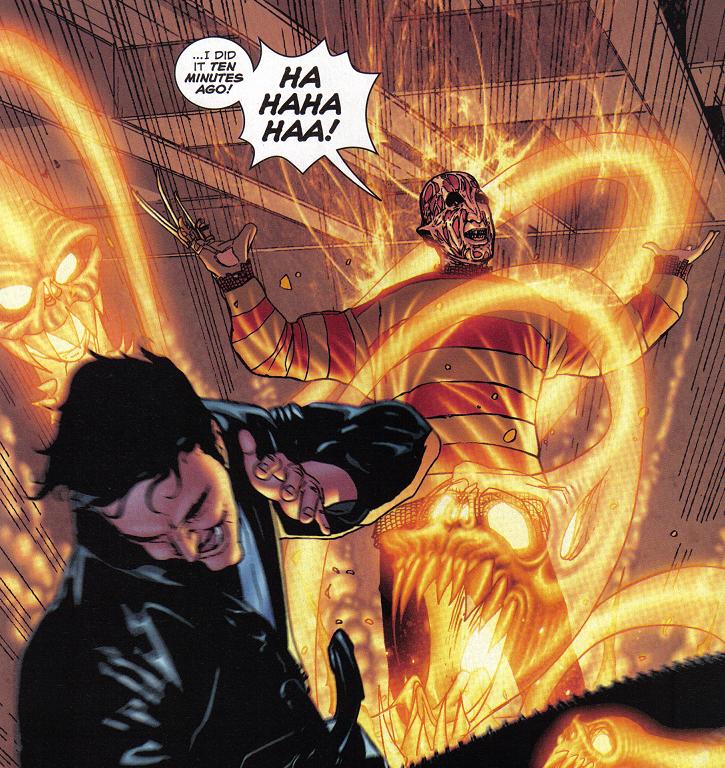 When Ash goes looking for the Necronomicon in the Voorhees house Freddy leaves the book out in the open to lure Ash close before ambushing him, impaling Ash through shoulder with his claws. With Ash temporarily incapacitated Freddy reveals he has read the entire Necronomicon and now can exert control over reality itself. Pinning Ash to a wall with replicas of his own bladed hand Freddy prepares to kill him when Jason crashes onto the scene, having decided to turn against Freddy due to his new intelligence telling him that he's being both tricked and used once again. Bemused by Jason's betrayal, Freddy uses his newfound powers to summon Deadite versions of some of Jason's former victims. Toying with Jason for a bit, Freddy soon decides to leave him to the Deadites and prepares to go off and begin killing across the world, only to realize Ash and the Necronomicon are gone.[3]