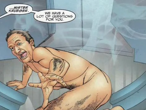 Though trapped in another dimension is Freddy is still capable of interacting with Earth to a limited degree, appearing to Jason as his mother hours after their battle with Ash, instructing him to find and kill Ash. Six months after giving Jason his orders Freddy appears in visions had by both Ash and his old enemy Alice Johnson, appearing to the former when he is driving home from the store and the latter when she is in a movie theater. Through the covert government group Project Black Book utilizing both the Necronomicon and advanced technology Freddy (unburnt and seemingly powerless) is eventually returned to Earth on July 2, 2009. Kept in custody Freddy is interrogated by Director Gordon Russell, who wishes to know how he obtained his power over dreams, coming to the conclusion that it involved the Necronomicon. Fairly laid back Freddy goes along with Russell, who claims he can get Freddy access to the book with little time.[4]